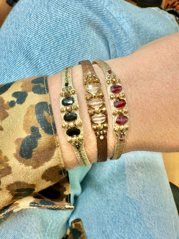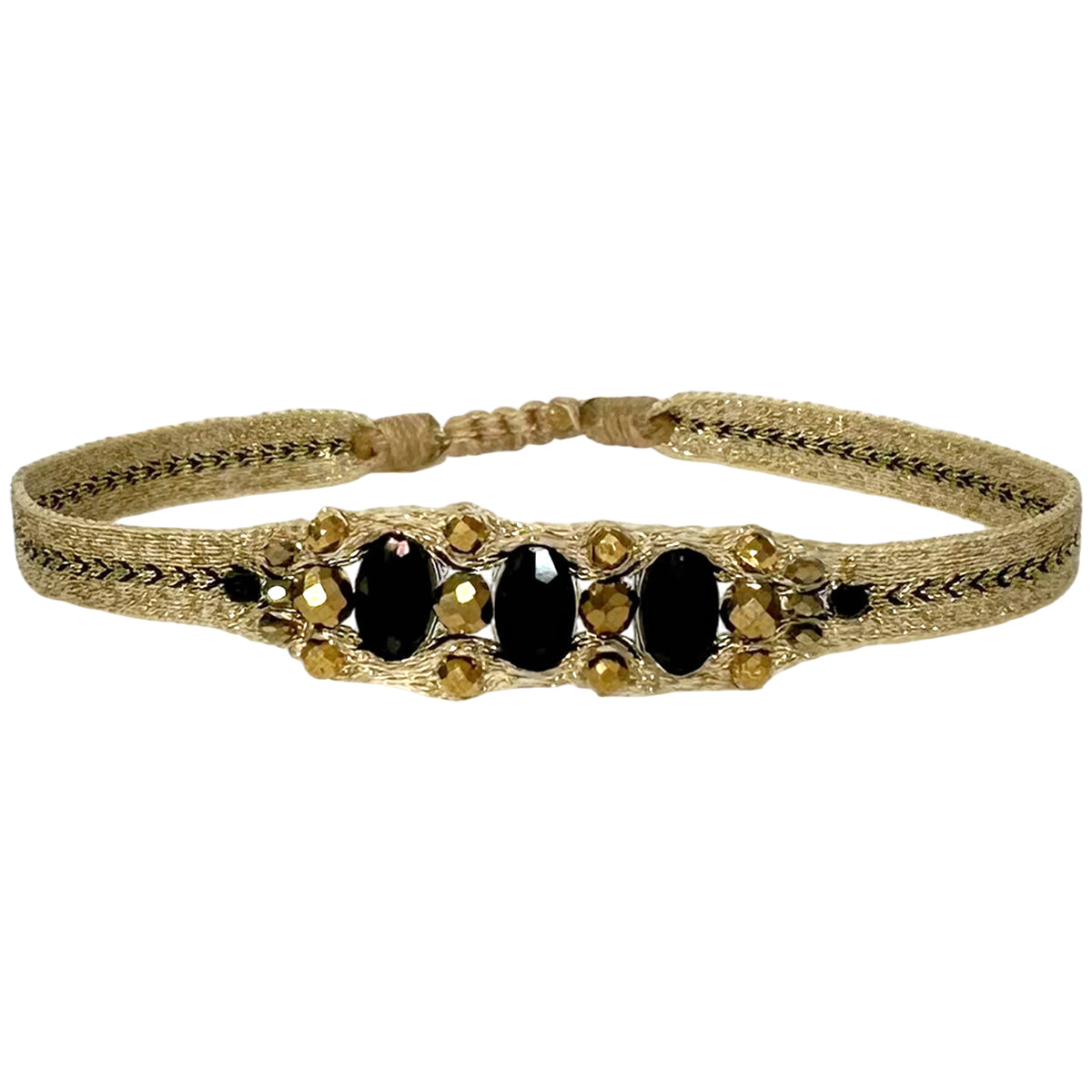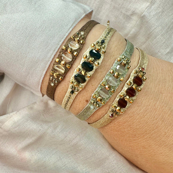 A true masterpiece of artisanal skill, the Victoria bracelet is handcrafted with meticulous care, using 80 finely woven threads accented with delicate golden touches. At its heart, the artisan intricately weaves a series of luminous stones, culminating in three larger, striking stones that form the centerpiece—radiant, bold, and unforgettable.