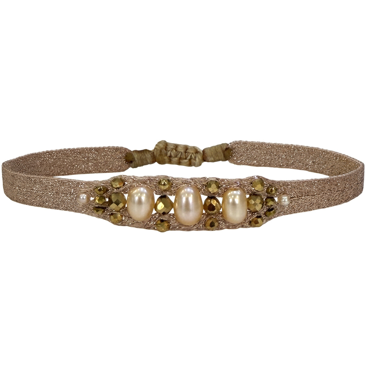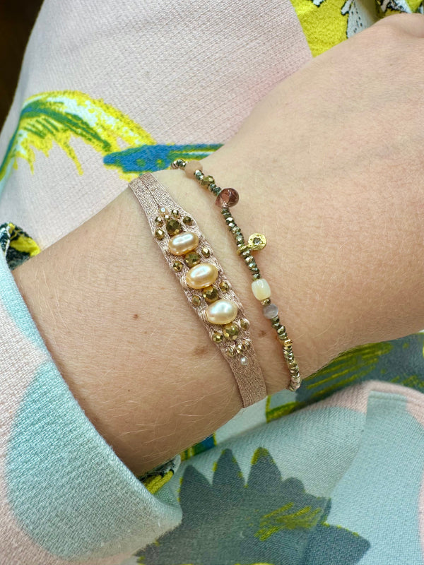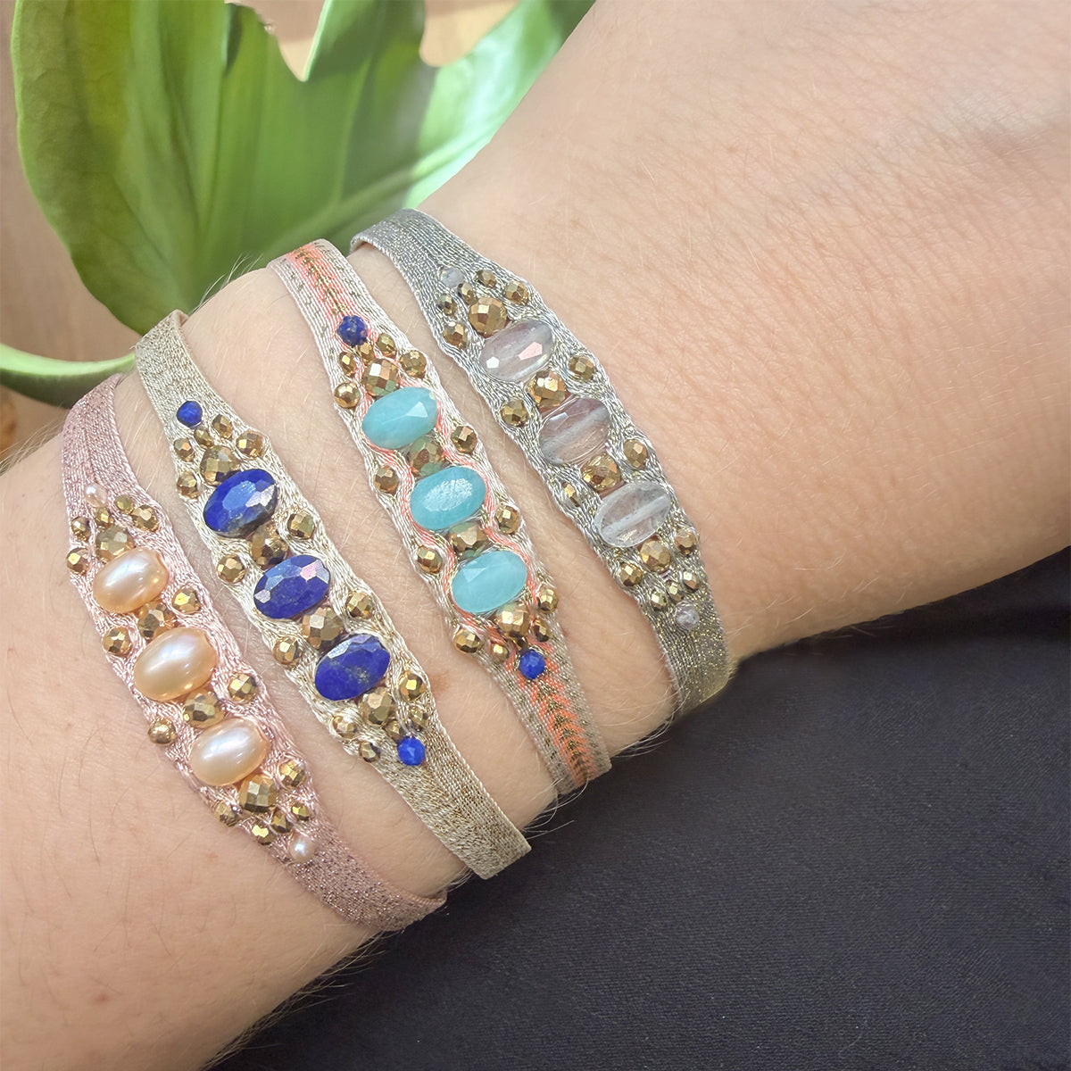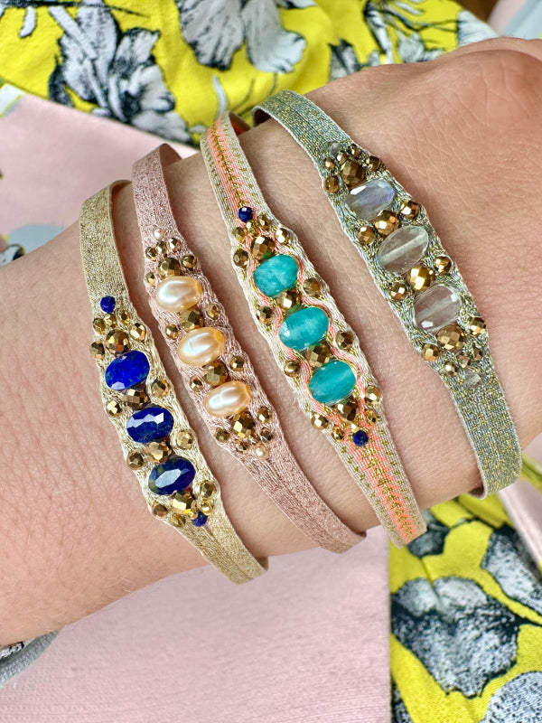 A true masterpiece of artisanal skill, the Victoria bracelet is handcrafted with meticulous care, using 80 finely woven threads accented with delicate golden touches. At its heart, the artisan intricately weaves a series of luminous stones, culminating in three larger, striking stones that form the centerpiece—radiant, bold, and unforgettable.