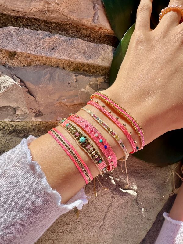 This beautiful handwoven bracelet features a mix of 14k gold filled beads and intermixed semi-precious stones. The variety of tones are an incredible mix, as well as the delicate pattern of this bracelet can be worn all season long.