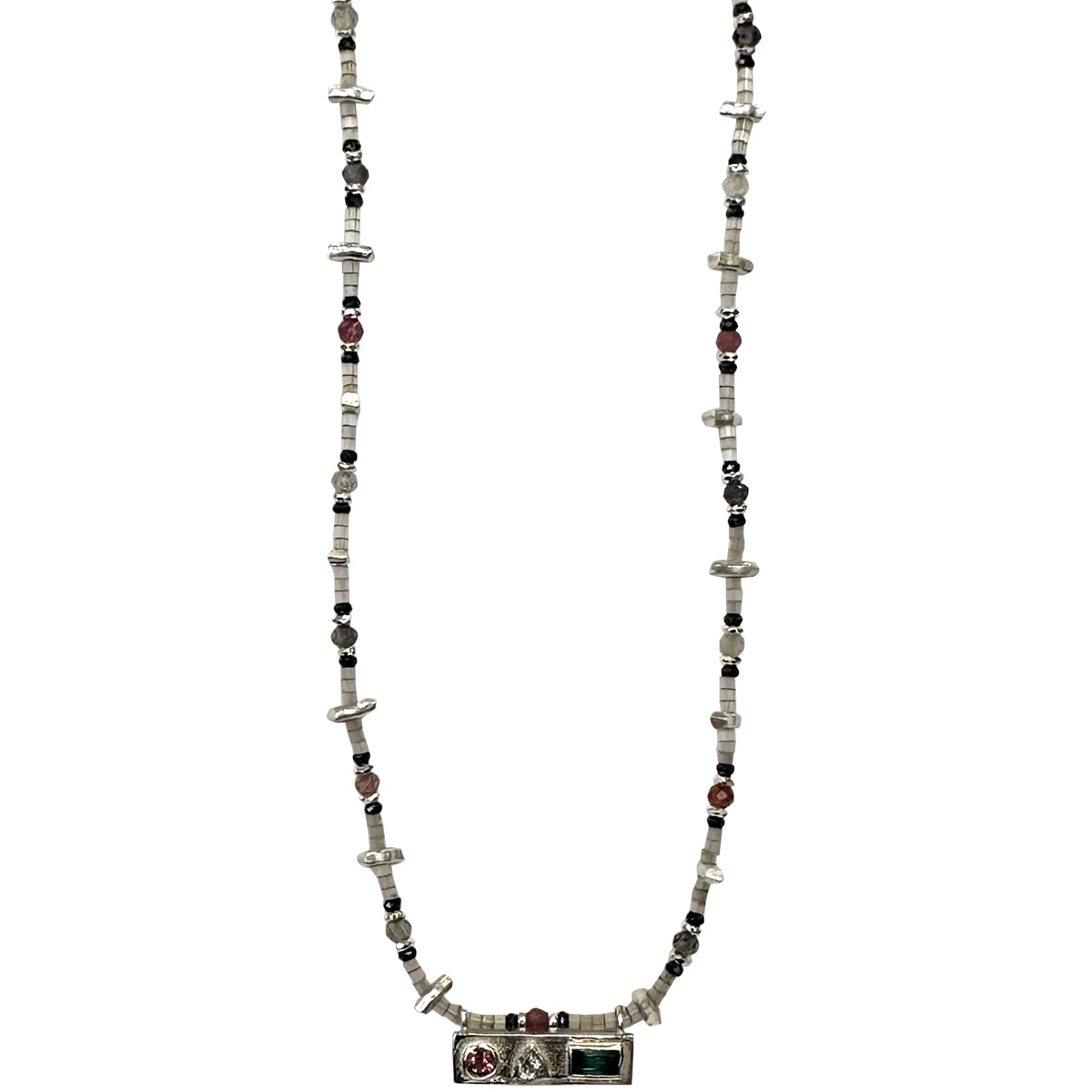 The necklace is crafted with 925 sterling silver components and showcases a harmonious combination of semi-precious stones such as Watermelon Tourmaline and Labradorite, complemented by Hematite and delicate Japanese glass beads. The blend of textures and tones creates a luxurious, timeless design with a modern edge.
