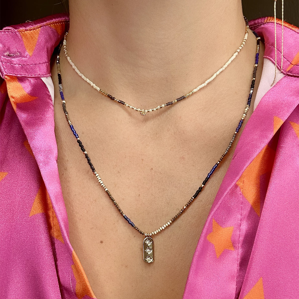 Stars Charm Necklace in Blue, Gold & Grey Tones