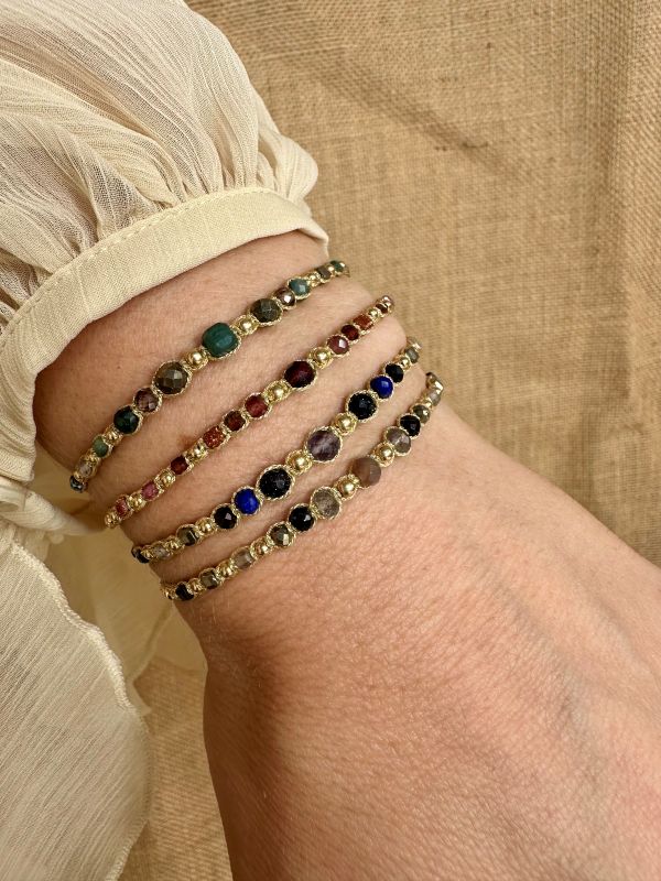 Introducing our exquisite new EVA bracelet, a stunning piece that beautifully combines artistry and elegance. Handmade with care, this bracelet features shiny metallic threads that create a captivating shimmer, enhancing its overall allure. Adorned with a selection of beautiful gemstones in various sizes, each bracelet is truly one-of-a-kind, ensuring you wear a unique accessory that reflects your individual style. Perfect for any occasion, the EVA bracelet adds a touch of sophistication and charm to your collection. Embrace the beauty of handmade jewelry and make a statement with this exceptional piece!