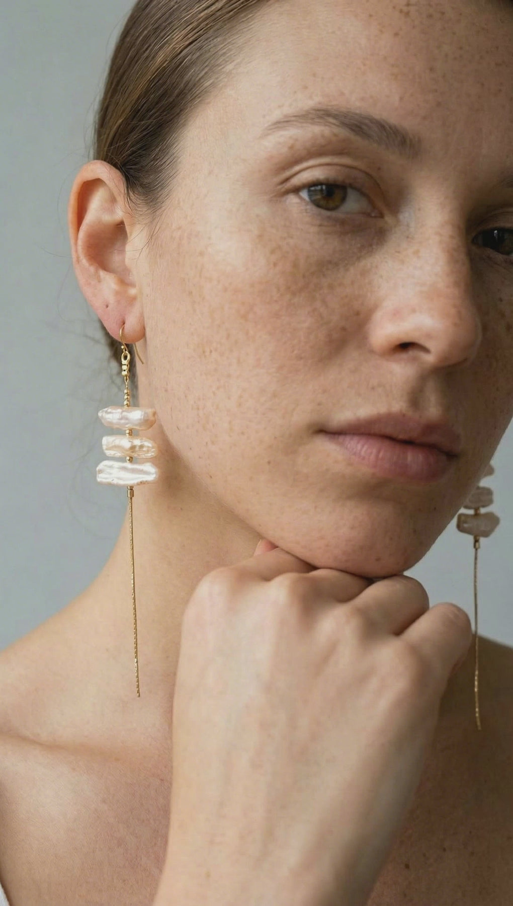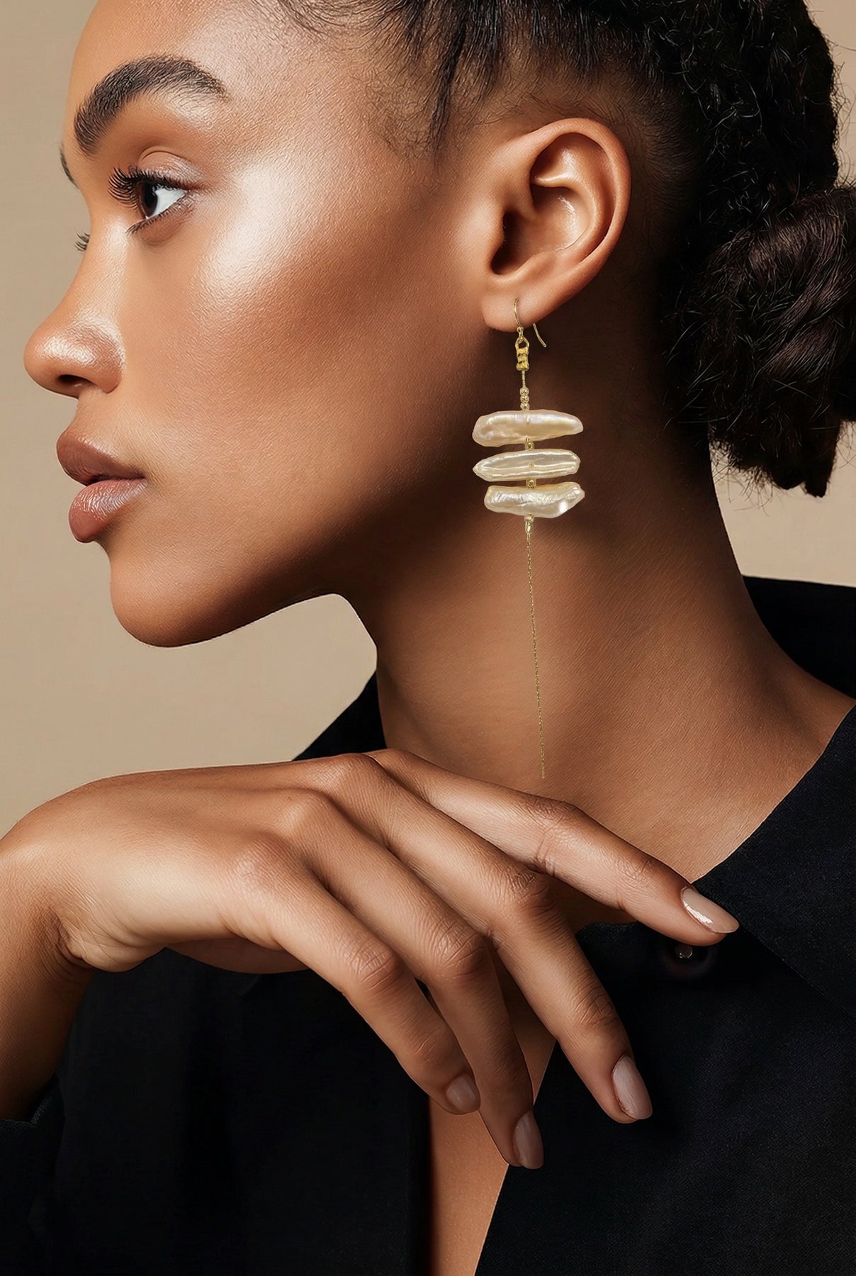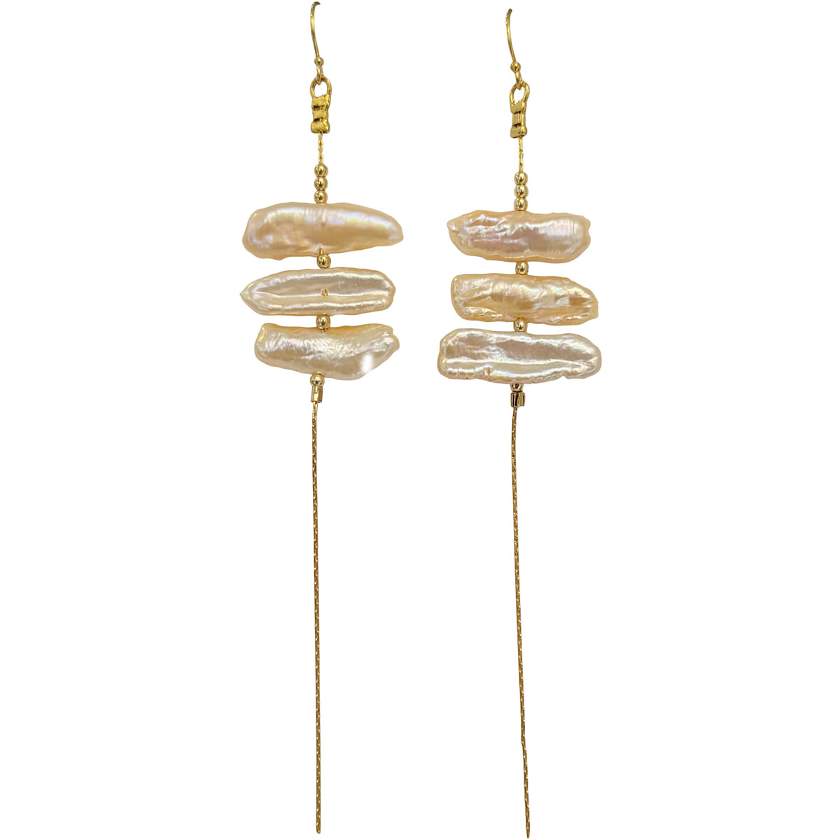 Graceful and modern, these handcrafted earrings feature three organically shaped freshwater pearls arranged in a delicate vertical design. Each luminous pearl is naturally unique, creating a soft, elegant texture that catches the light with every movement. A fine gold chain extends below the pearls, adding fluid movement and a refined, contemporary silhouette.