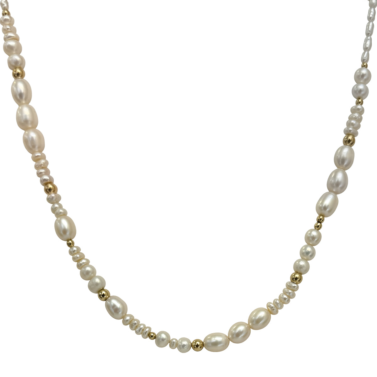 Composed of sweet water pearls in varying shapes and sizes, each piece is uniquely textured and softly luminous. Accented with 14k gold-filled beads and findings, it offers a refined balance between classic and modern design.