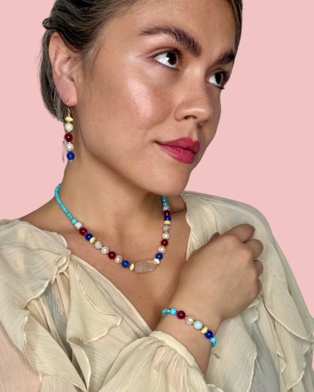 Made by hand using a thoughtful mix of semi-precious stones—agate, howlite turquoise, and quartz—this bracelet is accented with luminous freshwater pearls and grounding hematite details. The soft, ocean-inspired tones create a versatile piece that complements any look, from everyday wear to special occasions.