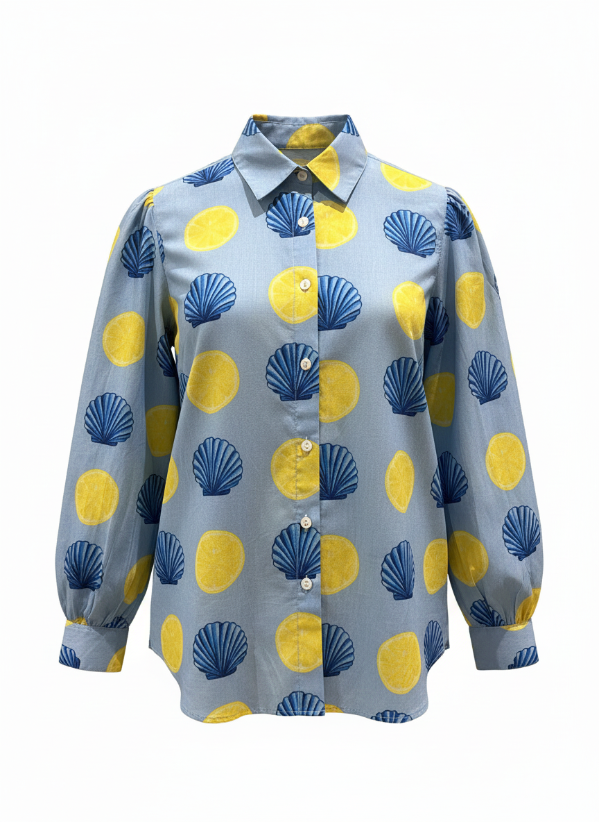 Made from 100% premium cotton, it features a hand-drawn print of shells and lemons, blending coastal elements with a fresh, vibrant twist. The result is a design that feels both expressive and easy to wear — perfect for adding character to any look.