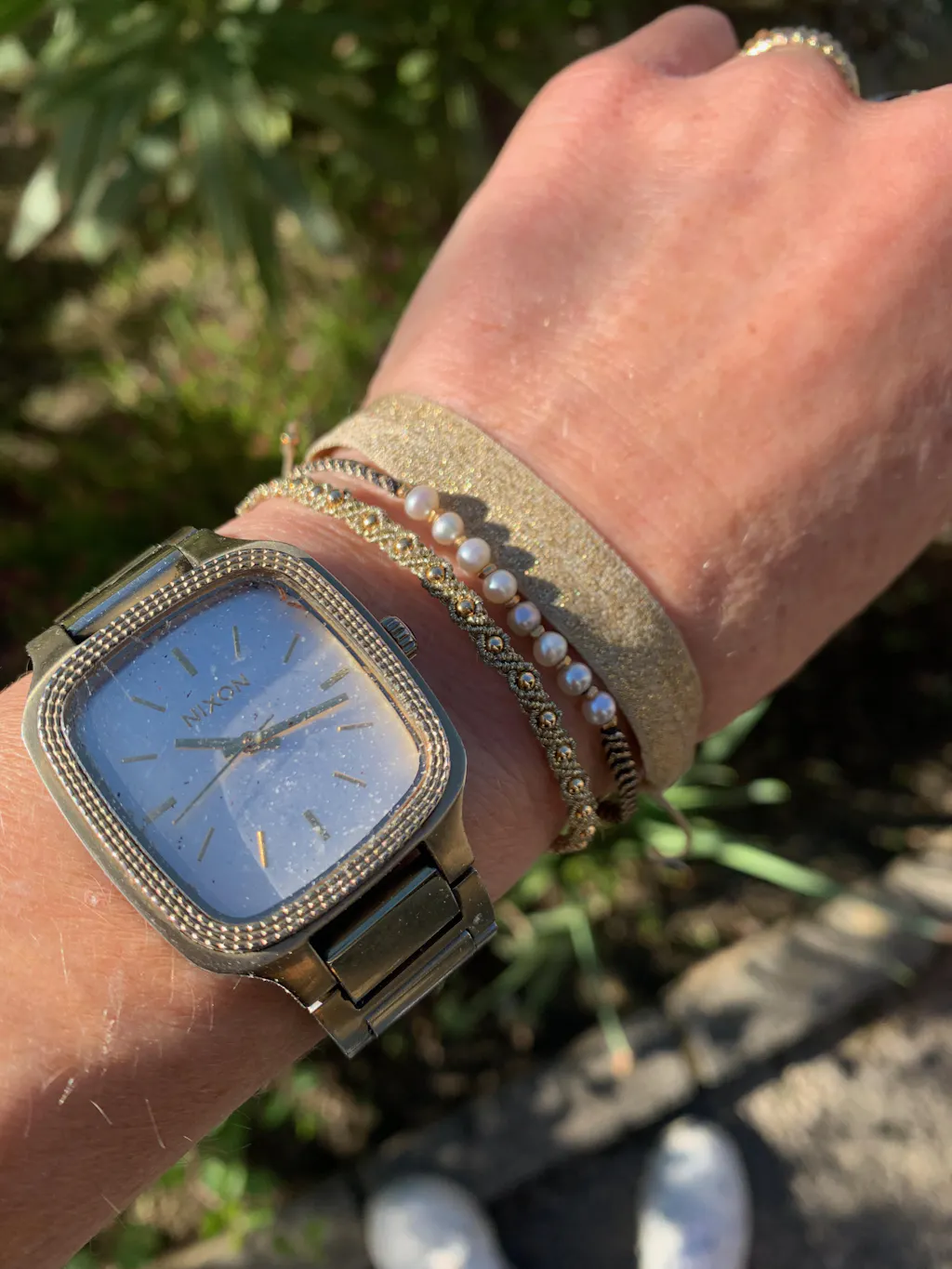 If you wish for simple elegance and versatility this handmade bracelet is just for you. It is handwoven by our team of artisans using 14 k gold beads and gold metallic threads.